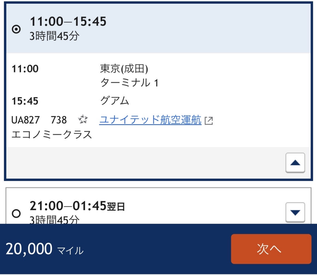 時期によりますが、今回20000マイルでグアム往復が行けます!(5000マイル余りますね)